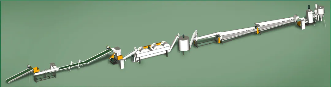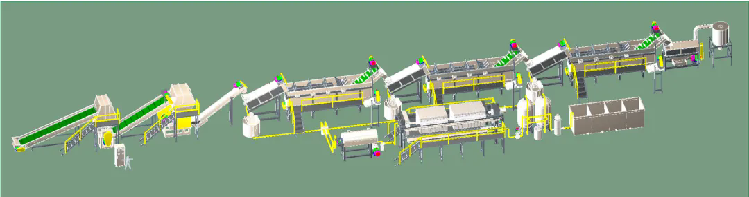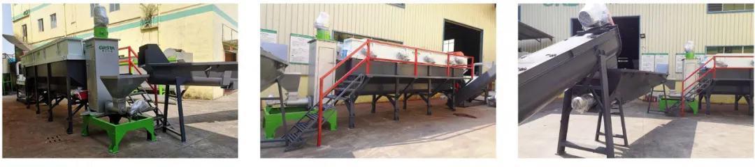 此套生產線主要處理日常生活中所廢舊的牛奶瓶、化妝品瓶、洗發水瓶、藍桶、廢舊框、塑料椅、塑料桶等HDPE、PP、PO等浮水硬質塑料的再生回收清洗,進而可以進行造粒后再利用。從節能、環保方面為用戶考慮,采用不同的方案流程,適合不同廢塑料的回收,提供配套的分揀輸送帶、高速清洗機、塑料表面不干膠標簽的去除、金屬分離器、水循環處理系統等。