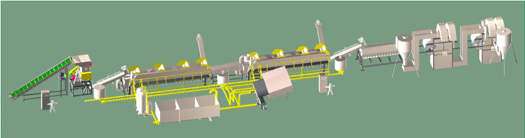 此套清洗回收生產線主要應用于回收汽車內外飾塑料件、中空包裝桶、廢舊物流托盤、家電外殼(ABS、PS脫漆清洗)等方面。根據不同的物料特性,設計針對性的回收方案。提供配套的分揀輸送帶、高速清洗機、塑料表面不干膠標簽的去除、金屬分離器、水循環處理系統等。