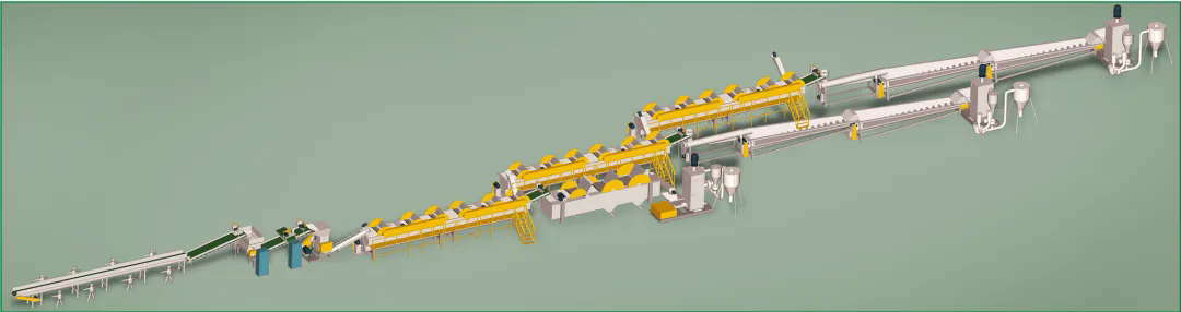 本設備生產出高質量的PET瓶片,可用于生產PET再生滌綸等長纖產品和其他高質量PET相關產品。該生產線外觀精美、能耗低、產量高,實用可靠。全新的漂洗裝置可以隨破隨洗,大大提高了生產效率,且洗料干凈,達到一級凈片要求。
