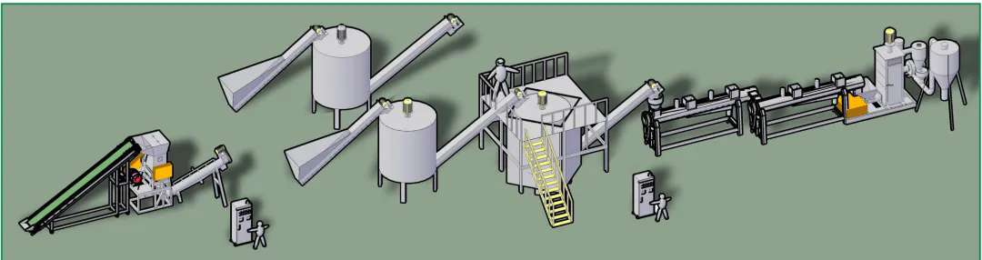 本套主要處理廢舊漁網,尼龍地毯,尼龍電纜,尼龍扎帶,纜繩,廢絲,安全網,尼龍布,線,尼龍膜PA,尼龍布頭,尼龍刨花,廢尼龍無紡布,廢尼龍簾子線,聚酰胺纖維,耐綸,MC尼龍下角料,PA12廢管,尼龍水口等尼龍廢料。可以滿足國內外對廢塑料再生處理的環保要求。